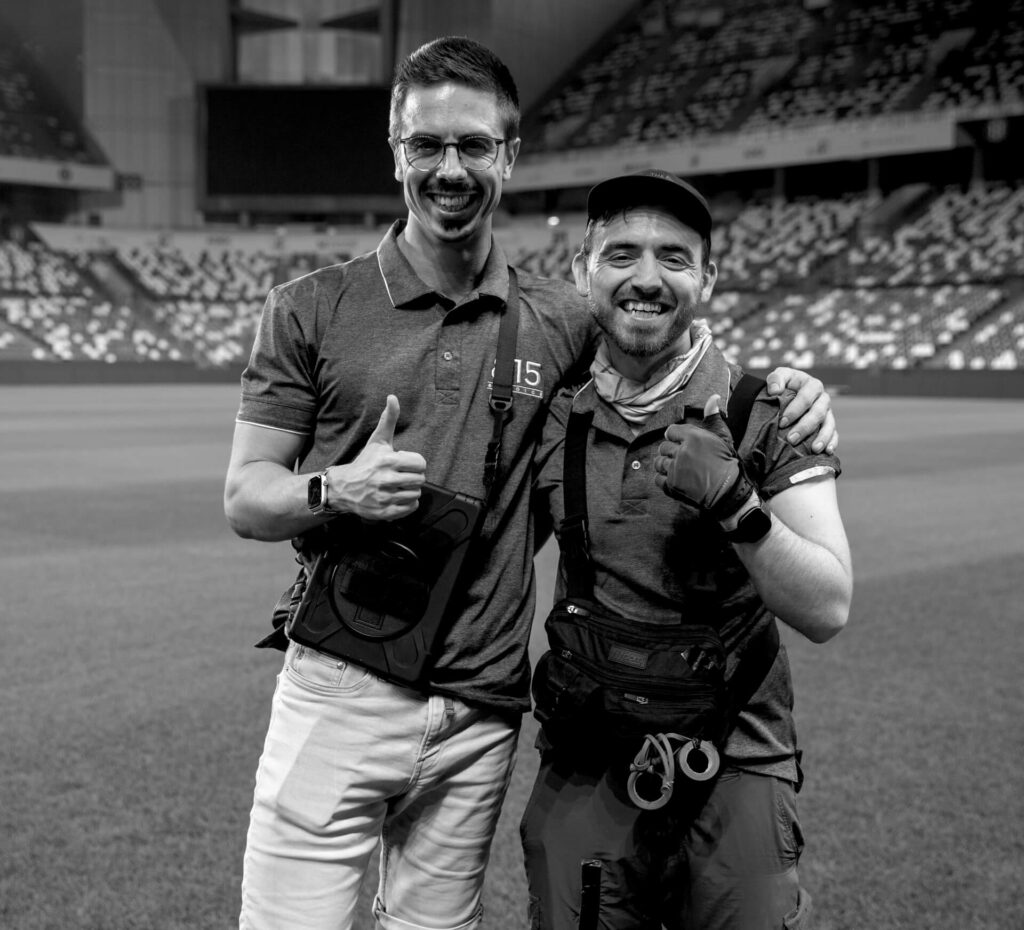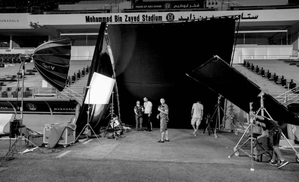 في هذا المشهد، صوّرنا باتجاه الأضواء الكاشفة، ما أتاح لنا التقاط انعكاسات ضوئية مذهلة. يعد استخدام وحدات الإضاءة داخل الإطار طريقة ممتازة لإضافة جاذبية بصرية ملفتة ورفع مستويات التباين في الصور بالأبيض والأسود. أما بالنسبة للمواقع الأخرى داخل الملعب التي إما افتقرت إلى الجاذبية البصرية أو التي تطلبت بناء مواقع تصوير صغيرة في الموقع، قمنا بدمج تجهيزات إضاءة فلورية عملية في الإطارات. لم تعزز هذه التجهيزات الإحساس بالواقعية في مواقع تصويرنا الصغيرة فحسب، بل أيضاً جعلت الصور عديمة اللون أكثر ديناميكية وإثارة للاهتمام.